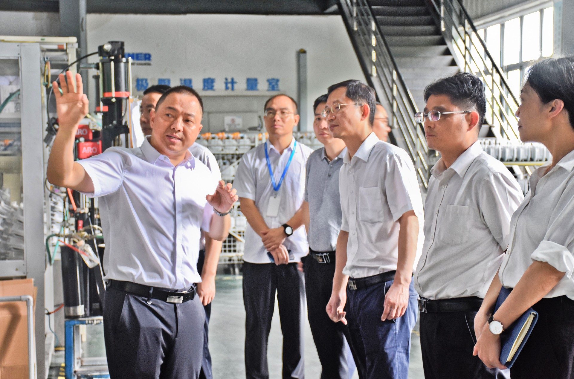 李德宝处长等领导一行先后参观了8868体育产品展厅、智能制造车间及计量检测中心。调研过程中,公司董事长李诗华、常务副总经理任海军分别就公司发展历程、产品研发成果、智能制造过程、计量检测与溯源以及行业市场等方面向领导作了工作汇报。