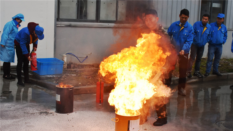 启动消防预案,灭火行动小组快速携带灭火器奔赴现场灭火,全体员工紧急撤离现场,直至所有人员疏散完毕。消防员现场演示了灭火器的使用方法。